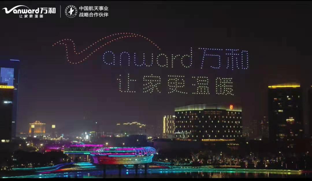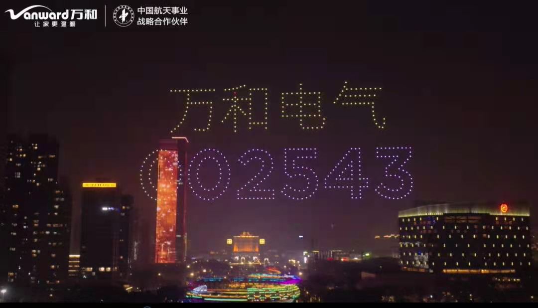 2021年1月27日晚,美麗的德勝河畔,流光溢彩的“金鳳凰”廣場,500架無人機騰空而已,相繼變幻出“萬和電氣 002543”、“上市十周年”、“花灑一開、熱水即來”、“全球5000萬家庭的溫暖選擇”、“萬和LOGO”、“我愛萬和”、“我愛順德”等文字和圖案,為萬和電氣(股票代碼:002543)上市十周年送上一份貼心的禮物,也點亮了當晚順德的夜空。