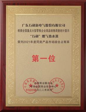 4月22日,中國商業(yè)聯(lián)合會(huì)、中華全國商業(yè)信息中心聯(lián)合主辦的“2022(第三十屆)中國市場商品銷售統(tǒng)計(jì)結(jié)果發(fā)布會(huì)”以線上直播形式召開,會(huì)上對2021年度中國消費(fèi)品市場銷售領(lǐng)先品牌等進(jìn)行了發(fā)布,根據(jù)全國大型零售企業(yè)商品銷售調(diào)查統(tǒng)計(jì)顯示,廣東萬和新電氣股份有限公司旗下的“萬和”燃?xì)鉄崴鳂s列2021年度同類產(chǎn)品市場綜合占有率第一位,這是“萬和”燃?xì)鉄崴鬟B續(xù)十八年年獲得此項(xiàng)桂冠,萬和已成為中國燃?xì)鉄崴黝I(lǐng)域當(dāng)之無愧的領(lǐng)導(dǎo)者。