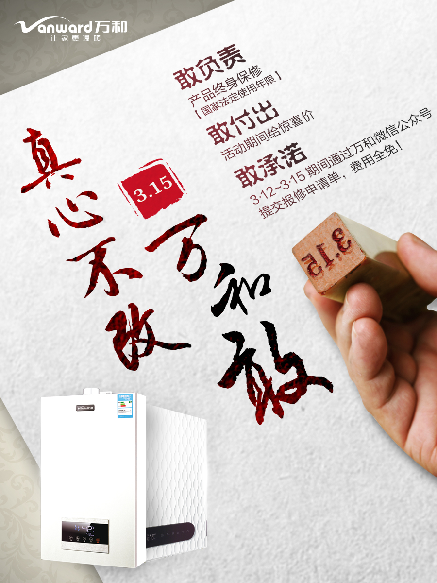 國內(nèi)熱水器、廚房電器專業(yè)制造企業(yè)及創(chuàng)領(lǐng)品牌——萬和,亦在全國開展了315大型回饋活動——“真心不改,萬和敢”,提出“品質(zhì)315,萬和敢負責(zé)、敢付出、敢承諾”。