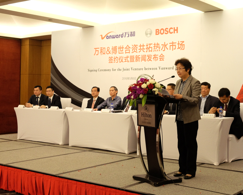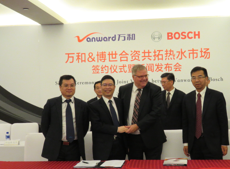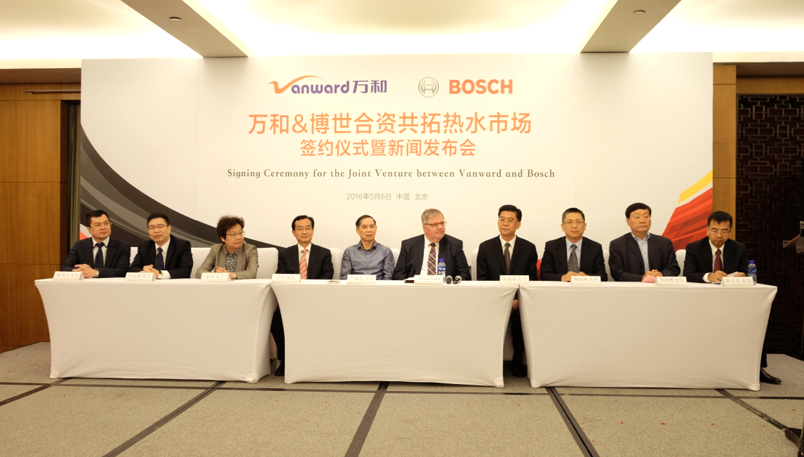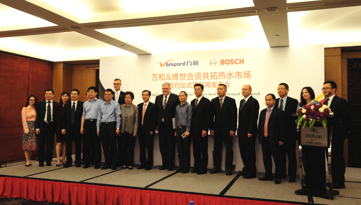 廣東萬(wàn)和新電氣股份有限公司(以下簡(jiǎn)稱(chēng)“萬(wàn)和”)和總部在韋茨拉爾的博世集團(tuán)熱力技術(shù)事業(yè)部(以下簡(jiǎn)稱(chēng)“博世”)達(dá)成共識(shí),將共同籌建合資公司,致力于熱水產(chǎn)品的研發(fā)和生產(chǎn)。萬(wàn)和與博世將對(duì)該合資公司分別持有一半股權(quán)。5月6日上午,雙方在北京舉行隆重的簽約儀式。萬(wàn)和集團(tuán)董事局主席盧礎(chǔ)其、萬(wàn)和電氣董事長(zhǎng)葉遠(yuǎn)璋、萬(wàn)和電氣副總裁楊頌文、博世熱力技術(shù)公司總裁 Uwe Glock、博世中國(guó)公司總裁陳玉東、中國(guó)家用電器協(xié)會(huì)理事長(zhǎng)姜風(fēng)、中國(guó)五金制品協(xié)會(huì)副理事長(zhǎng)兼燃?xì)庥镁叻謺?huì)秘書(shū)長(zhǎng)柳潤(rùn)峰、中國(guó)太陽(yáng)能熱利用產(chǎn)業(yè)聯(lián)盟秘書(shū)長(zhǎng)賈鐵鷹、合肥長(zhǎng)豐縣委書(shū)記許華、佛山高明區(qū)委副書(shū)記兼政府區(qū)長(zhǎng)黃棋泰及數(shù)十家媒體出席會(huì)議,共同見(jiàn)證。