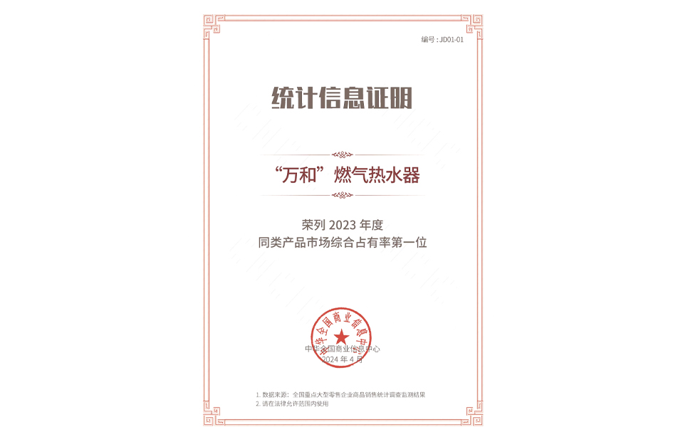 4月18日,由中國商業(yè)聯(lián)合會、中華全國商業(yè)信息中心聯(lián)合主辦 “2024中國消費(fèi)品市場發(fā)展大會暨第三十二屆中國市場商品銷售統(tǒng)計(jì)結(jié)果發(fā)布會”在北京中國職工之家召開,根據(jù)對全國大型零售企業(yè)商品銷售調(diào)查統(tǒng)計(jì)結(jié)果,中華全國商業(yè)信息中心認(rèn)定廣東萬和新電氣股份有限公司旗下的“萬和”燃?xì)鉄崴鳂s列2023年度同類產(chǎn)品市場綜合占有率第一位,這已是“萬和”燃?xì)鉄崴鬟B續(xù)20年獲得此項(xiàng)桂冠。