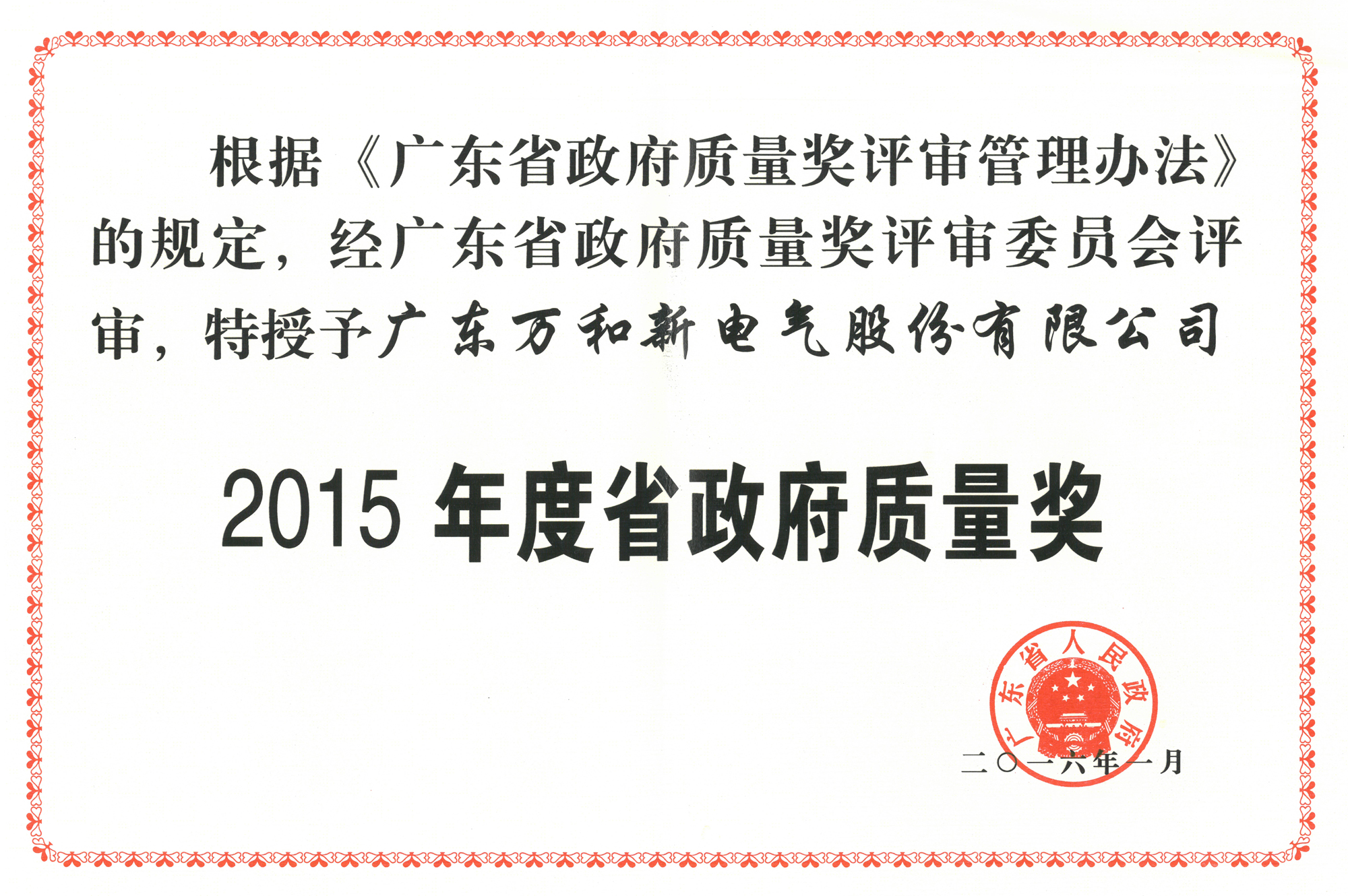 5月24日,廣東省質(zhì)量大會(huì)在廣州召開(kāi),中央政治局委員兼廣東省委書(shū)記胡春華、國(guó)家質(zhì)檢總局局長(zhǎng)支樹(shù)平、廣東省長(zhǎng)朱小丹、省直機(jī)關(guān)及各地市領(lǐng)導(dǎo)共350余人出席會(huì)議。在本次會(huì)議上,廣東副省長(zhǎng)袁寶成宣讀了廣東省人民政府關(guān)于表彰2015年度廣東省政府質(zhì)量獎(jiǎng)獲獎(jiǎng)企業(yè)的通報(bào),并現(xiàn)場(chǎng)為廣東萬(wàn)和新電氣股份有限公司等9家獲獎(jiǎng)企業(yè)頒發(fā)了“廣東省政府質(zhì)量獎(jiǎng)”牌匾。