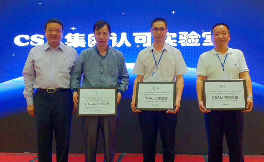 CSA集團中國及香港區(qū)副總裁蔣毅(左一)為獲得CSA認(rèn)可實驗室的企業(yè)代表(右二為萬和國際營銷中心副總經(jīng)理劉付錦)授牌。