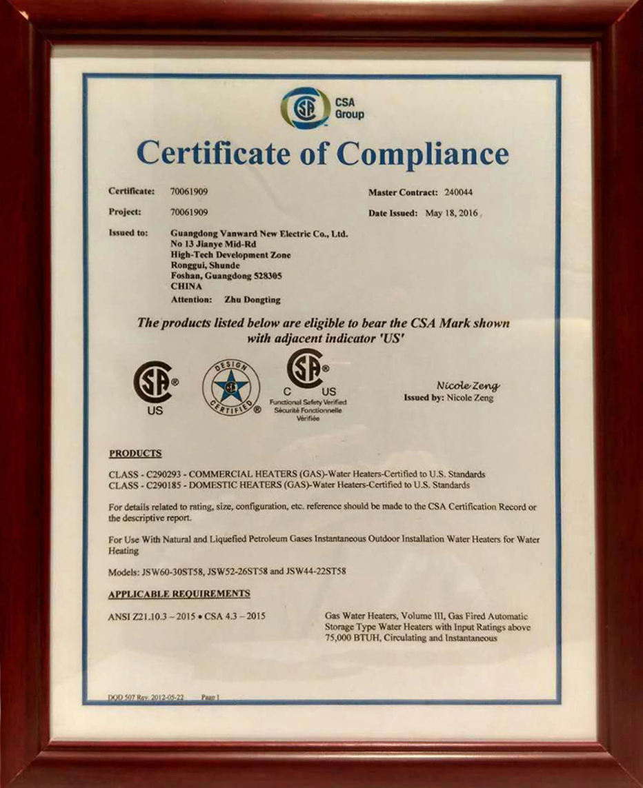 此外,由廣東萬和新電氣股份有限公司生產(chǎn)的三款“萬和”牌大流量燃氣熱水器也同時獲得CSA認(rèn)證,這標(biāo)志著萬和這三款大流量燃氣熱水器通過了北美市場的準(zhǔn)入“門檻”,以自主品牌拿到了進入美國、加拿大等北美市場的通行證。