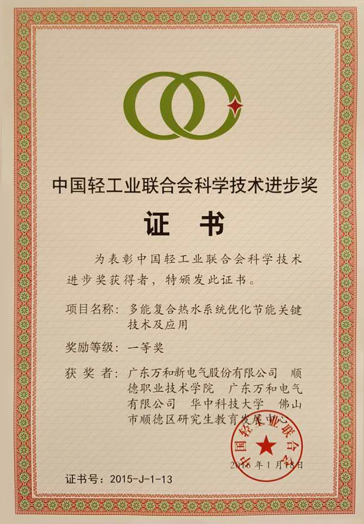 6月21日,中國(guó)輕工業(yè)聯(lián)合會(huì)在北京召開大會(huì),對(duì)2015年度獲得中國(guó)輕工業(yè)聯(lián)合會(huì)科學(xué)技術(shù)進(jìn)步獎(jiǎng)的項(xiàng)目進(jìn)行表彰,在本次大會(huì)上,由廣東萬(wàn)和新電氣股份有限公司領(lǐng)銜研發(fā)的“多能復(fù)合熱水系統(tǒng)優(yōu)化節(jié)能關(guān)鍵技術(shù)及應(yīng)用”項(xiàng)目獲得中國(guó)輕工業(yè)聯(lián)合會(huì)科學(xué)技術(shù)進(jìn)步獎(jiǎng)一等獎(jiǎng),這也是熱水器行業(yè)唯一獲得一等獎(jiǎng)的項(xiàng)目。此外,萬(wàn)和單獨(dú)研發(fā)的“微熱損高效全預(yù)混燃?xì)鉄崴鳌表?xiàng)目也獲得中國(guó)輕工業(yè)聯(lián)合會(huì)科學(xué)技術(shù)進(jìn)步獎(jiǎng)三等獎(jiǎng)。